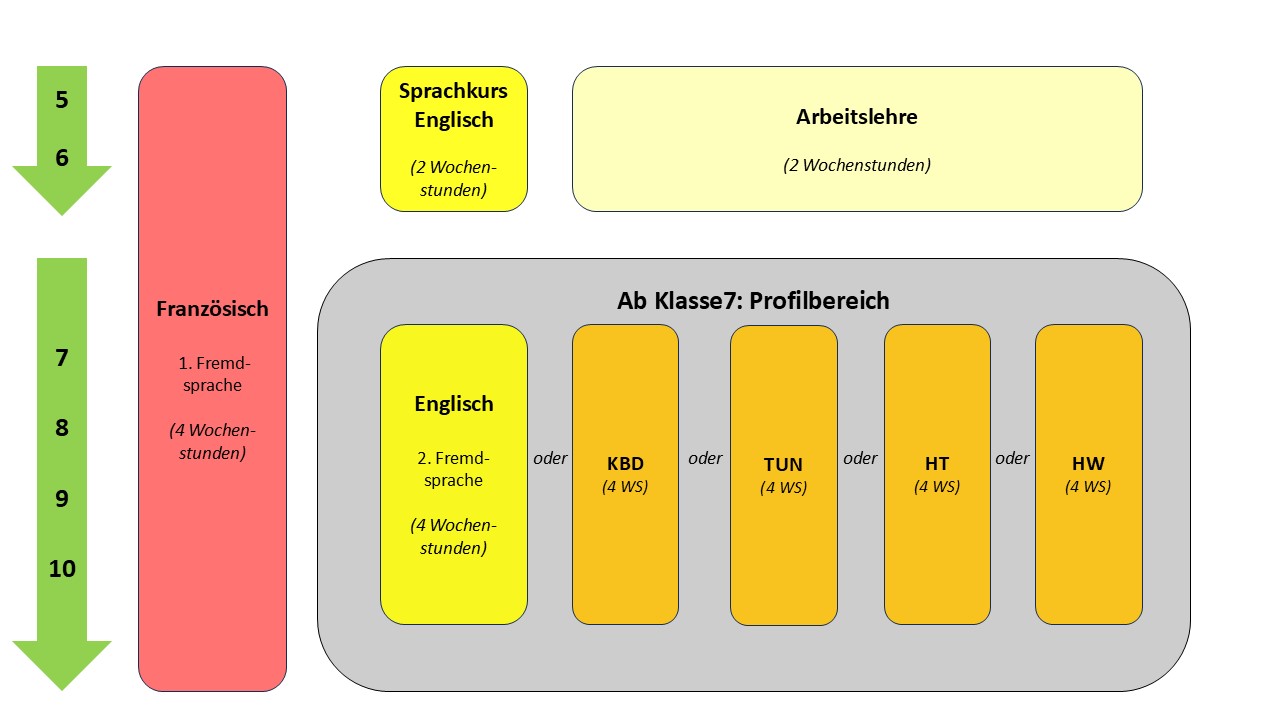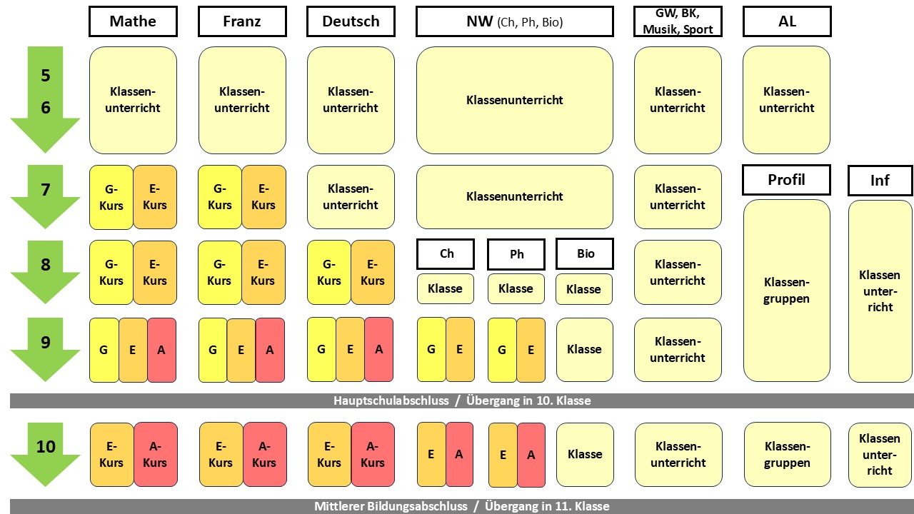 Die Schülerinnen und Schüler lernen in den Klassen 5 und 6 im Klassenverband. Mit Beginn der Klassenstufe 7 werden die meisten Fächer nach und nach differenziert unterrichtet, das heißt, die Schülerinnen und Schüler werden in verschiedene Lerngruppen eingeteilt. Grundsätzlich gibt es die folgenden Anspruchsebenen: