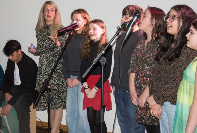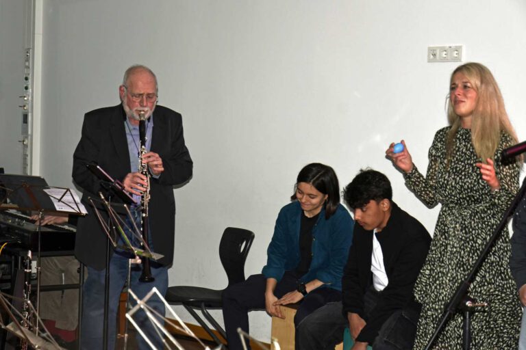 Wenn Töne leuchteten, dann an diesem Abend in der Mensa der Gemeinschaftsschule Leonardo-da-Vinci. Die Musikerin Clara Wigger und der Musiker Helmut Eisel erstrahlten für kurze Zeit in einem gedämpften Licht von Magenta und performten ihre Stücke auf der Klarinette unmittelbar vor den Augen der Zuschauerinnen und Zuschauer. Am Klavier tat sich mit zum Teil auch jazzhaften Soloeinlagen Sebastian Voltz hervor. Stimmungsvoll ließen sich die Menschen von der Klarinettenmusik in eine traditionsreiche rhythmisch durchdringende Welt führen.  Neben dem Kantor Benjamin Chait, der laut und getragen den jiddischen Gesang interpretierte, war der Höhepunkt des Abends der Gesang der Musiklehrerin und Opernsängerin Martina Ondrujj, die sich liebevoll in die Lieder einfühlte. Aber was wären diese Lieder ohne die Stimmen der Schülerinnen und Schüler aus den Klassen der 5a, 5b, 5c,7c, 9c, 7b? Unter der Anleitung ihrer Musiklehrerinnen Martina Ondruj und Salina Singh begeisterten sie sich für den Gesang und formten gekonnt die Töne.